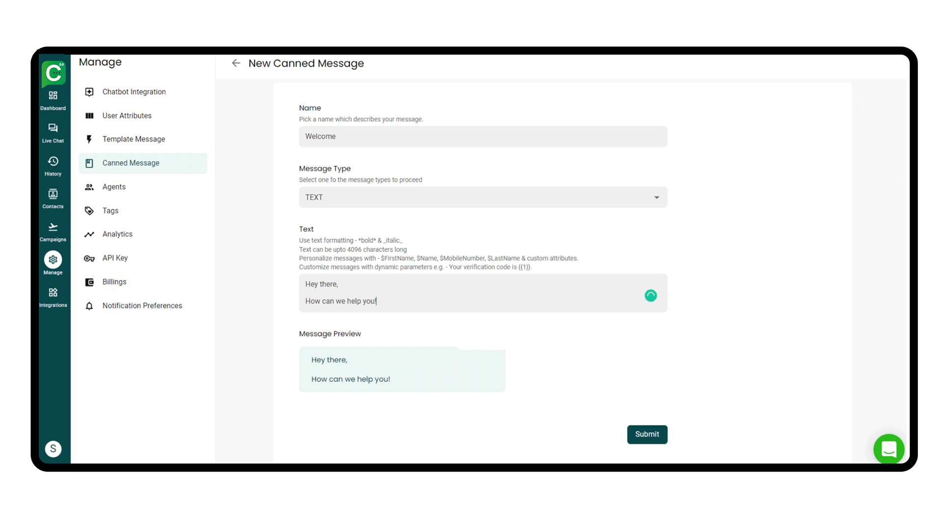 Instead, you can use Canned Messages to save your responses and then send them to your users with a single click from the live chatbox.