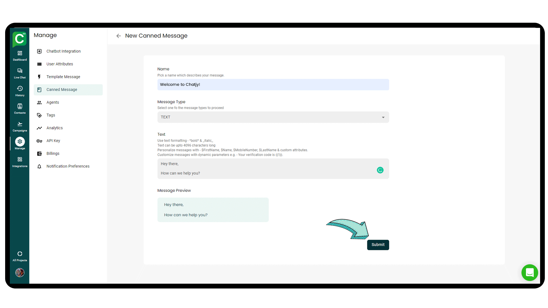 We’ve selected Welcome Canned Message to send to the user in the image.