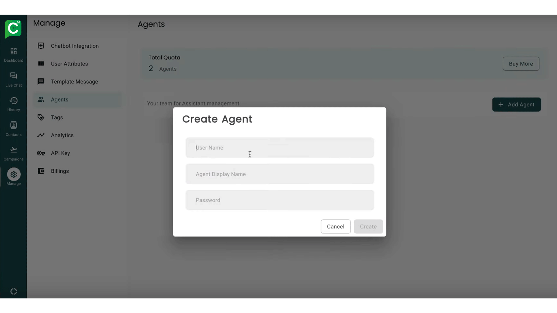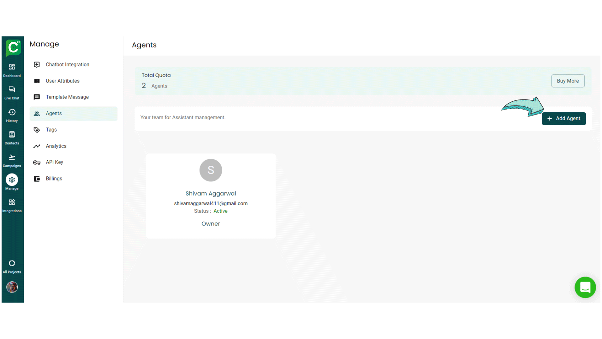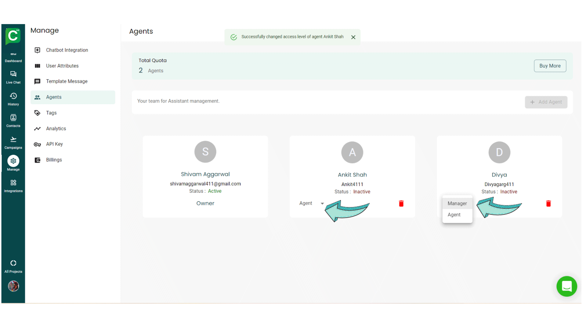 The final step is to assign Agents roles and responsibilities. In Chatjy App, you can assign either ‘Agents’ or ‘Managers.’