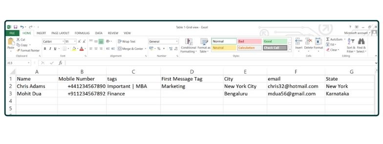 Please use the left-hand image above to reference the CSV file’s standard format. The fact that Mohit Dua’s First Message Tag field is empty merely implies that, following import, this field will be empty as well on the contacts page.