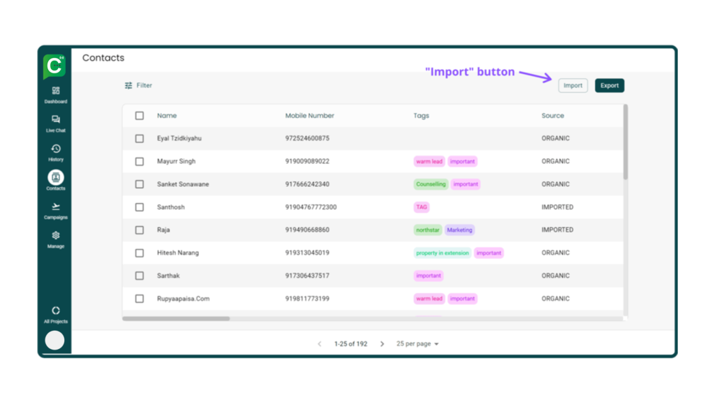 Select the “Import” button, which is next to the “Export” option in the top right corner of the Contacts Page.