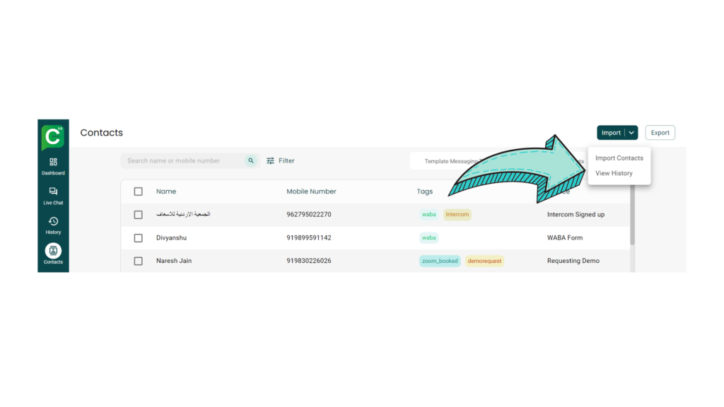 To examine a list of all the contacts added to the AiSensy App, click the icon labelled “View History.”