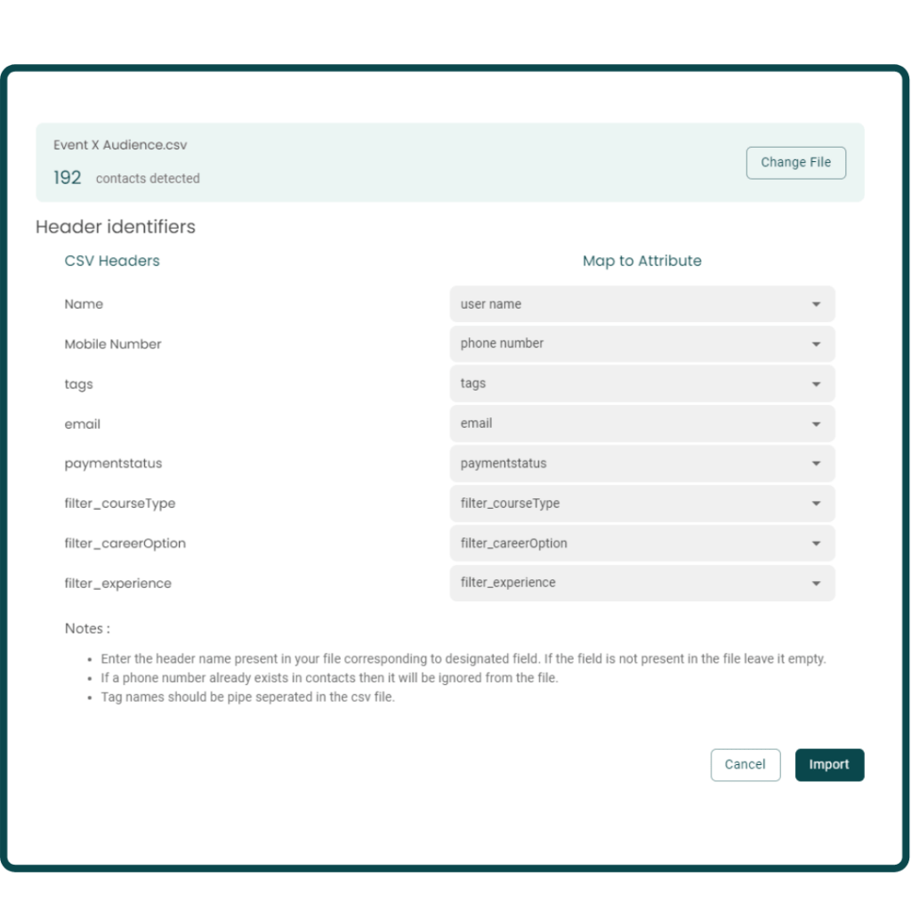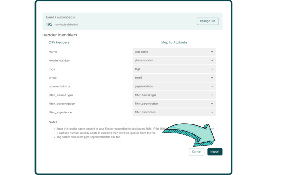 The column headings of the.csv file would be on the left side. The properties of your Chatjy Contacts Page would be on the right. As an illustration, “Name” will be mapped to “user name,” “Mobile Number” to “phone number,” and so on.