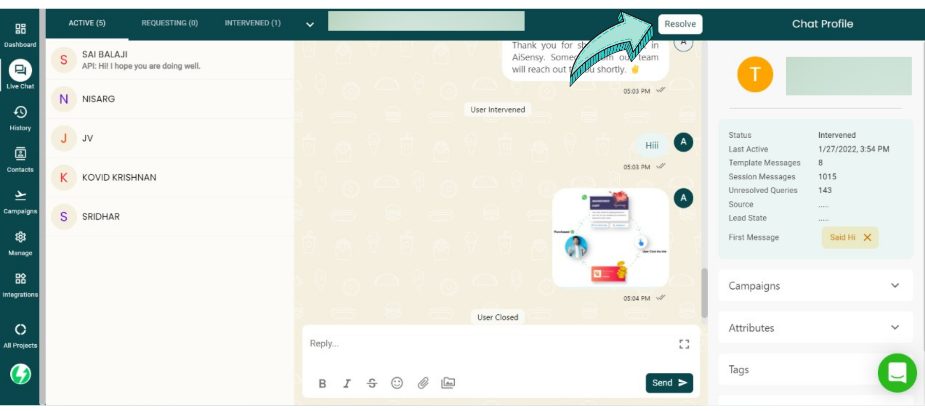 The only person who can see the Chat is the agent who intervenes. So, after successfully resolving a query, request that your agent click the ‘Resolve’ button so that the chat is visible to all.